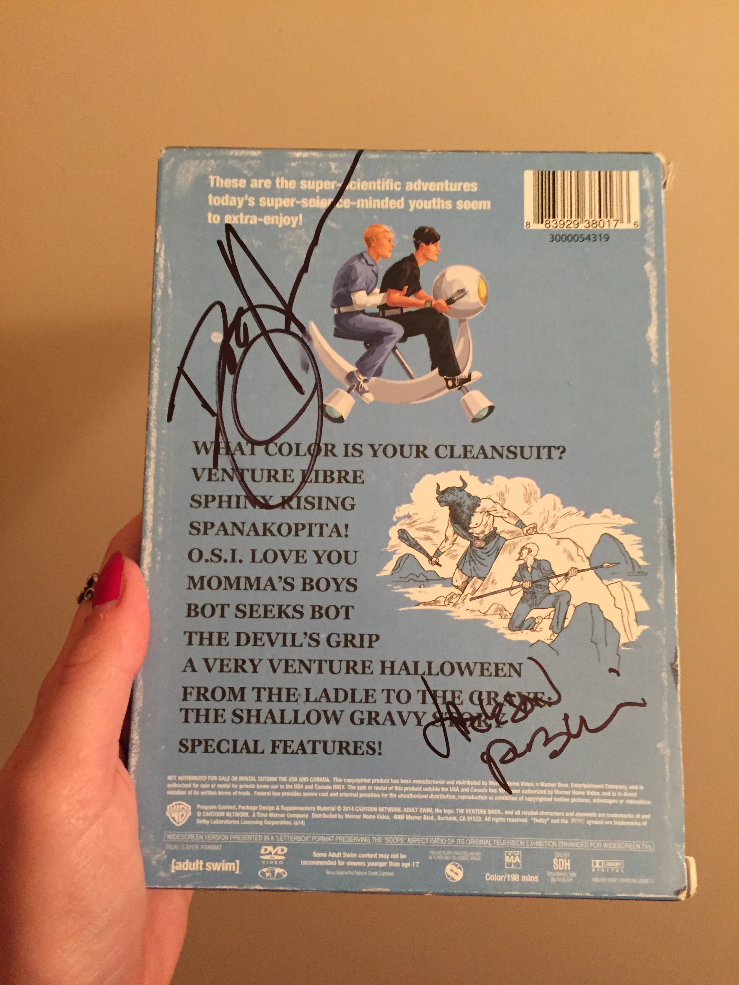 - Have a Sharpie and the stuff you want signed with you at all times!!! You never know when you’ll run into the person you want to sign it. I was going to wait for the Venture Bros panel on Sunday, but I ran into Doc Hammer at the merch table at the Gonzo panel on Saturday and was able to run back to my seat and grab my DVD and Sharpie and get it signed.